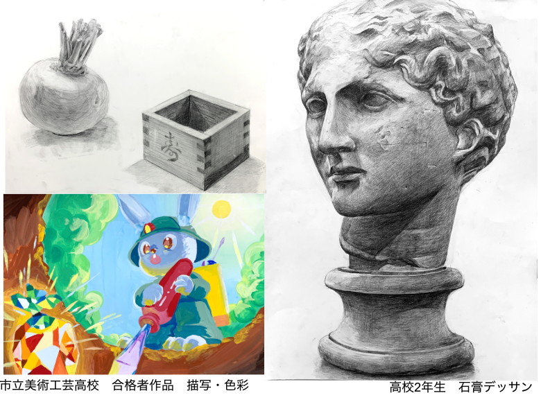 大阪府立工芸高等学校・大阪府立港南造形高等学校を目指す中学生のクラスです。描写・色彩の基礎を身に付け、入試に対応できる応用力まで幅広く養います。